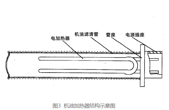 康明斯公司生產的機油電加熱器結構如圖3所示,主要是由機油濾清管及電加熱器構成,電加熱器固定在機油濾清管中,與電加熱器聯結在一起電源插座固定在機油濾清管的管座上。該柴油發電機機油電加熱器和現有技術相比,具有設計合理、結構簡單、易于加工、體積小、使用方便、省時省工省力等特點,而且對現有各種柴油發電機的形狀和性能產生任何影響。因而,具有很好的推廣使用價值。