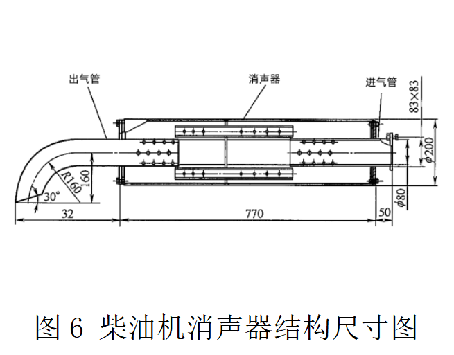 如圖6所示為基本型柴油機的消聲器,它是多腔膨脹共振型(在膨脹筒圓周充填有吸聲的超細玻璃纖維),在標定工況下可使噪聲下降約30dB(A)。